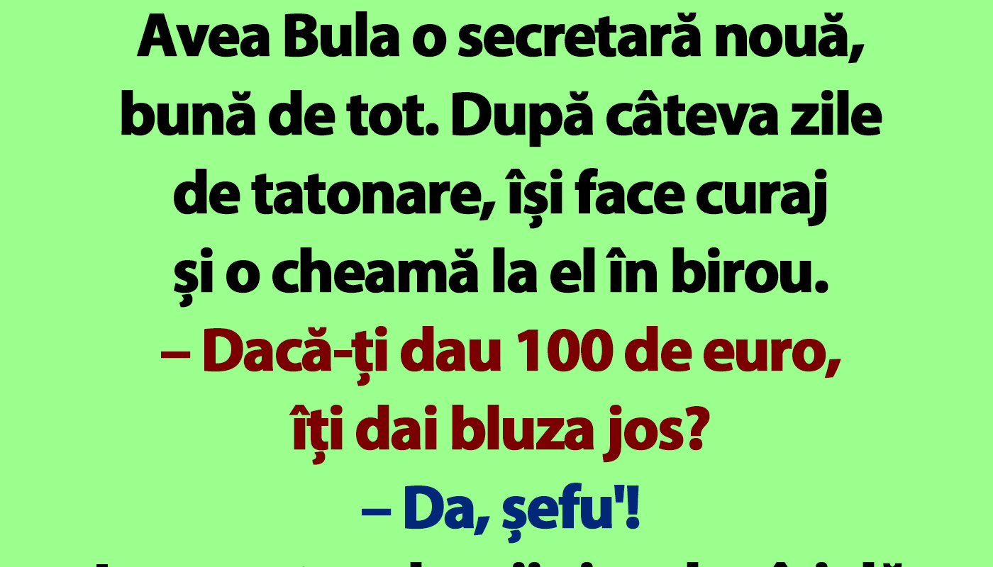 Avea Bula o secretară nouă, bună de tot. După câteva zile de tatonare, își face curaj și o cheamă la el în birou.
