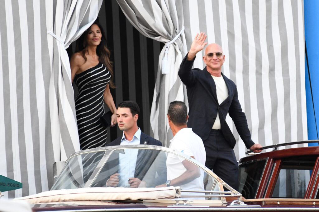 Activiști ai mișcării Extinction Rebellion au protestat joi în Piața San Marco din Veneția, chiar în prima zi a nunții miliardarului Jeff Bezos.